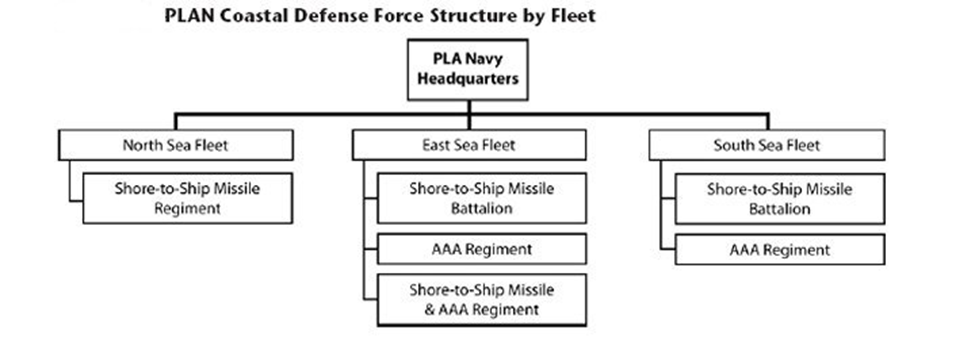 PLAN is divided by three fleets: North Sea Fleet that is based in Yellow Sea, The South Sea Fleet that is based in South China Sea, and The East Sea Fleet that is based in the East China Sea. PLAN Coastal Defense Force as a land-based fighting force has at least 25,000 personnel which each regiment and battalion are under support base or headquarters (Pike J, 2011).
